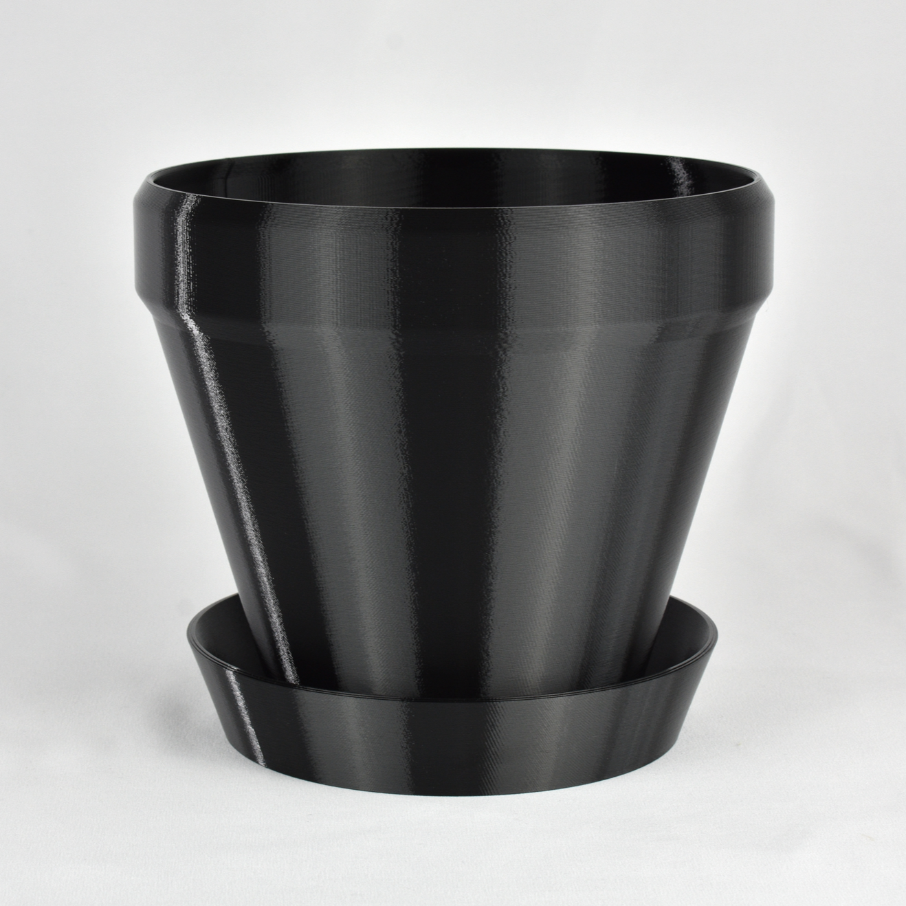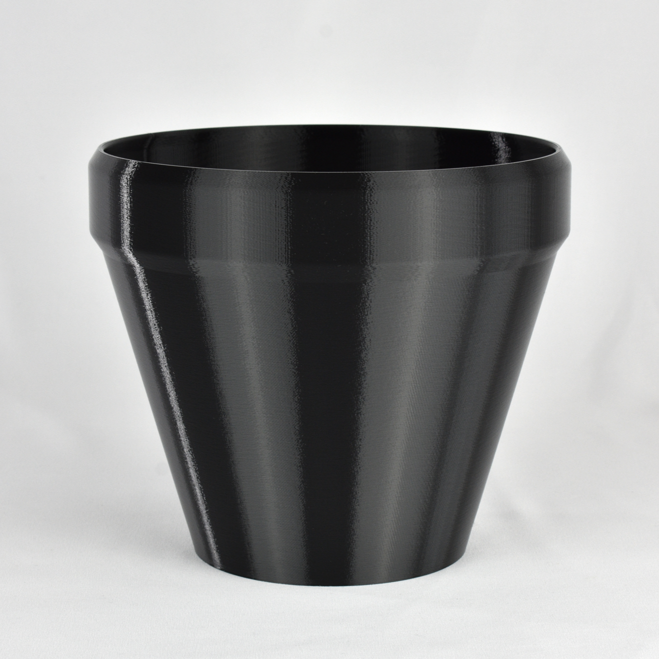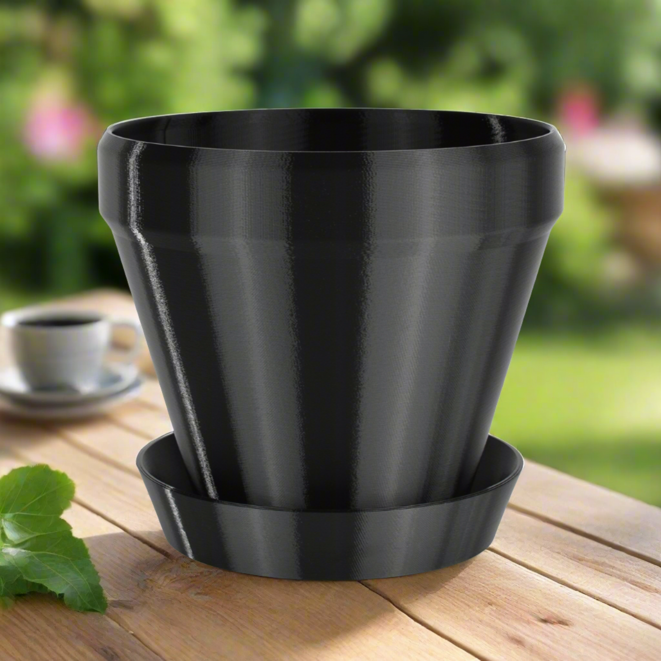 This classically shaped 8-inch black flower pot is suitable for both indoor and outdoor use, making it a perfect planter for passionate gardeners. Its 3mm thick walls and ample size make a statement while offering durability and generous proportions for larger plants.