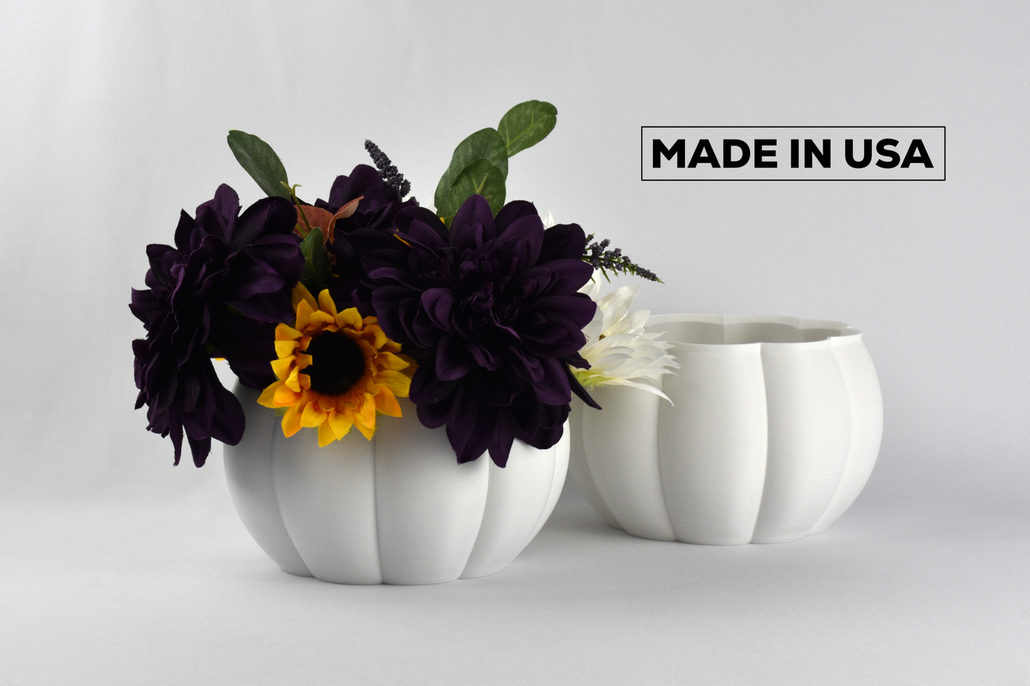 All of our items are 3D printed and are made of PETG plastic. They are designed to be lightweight, durable, and elegant. This allows us to safely ship matte pumpkin planters inexpensively, as compared to heavy and fragile ceramics, while passing those saving on to our customers.